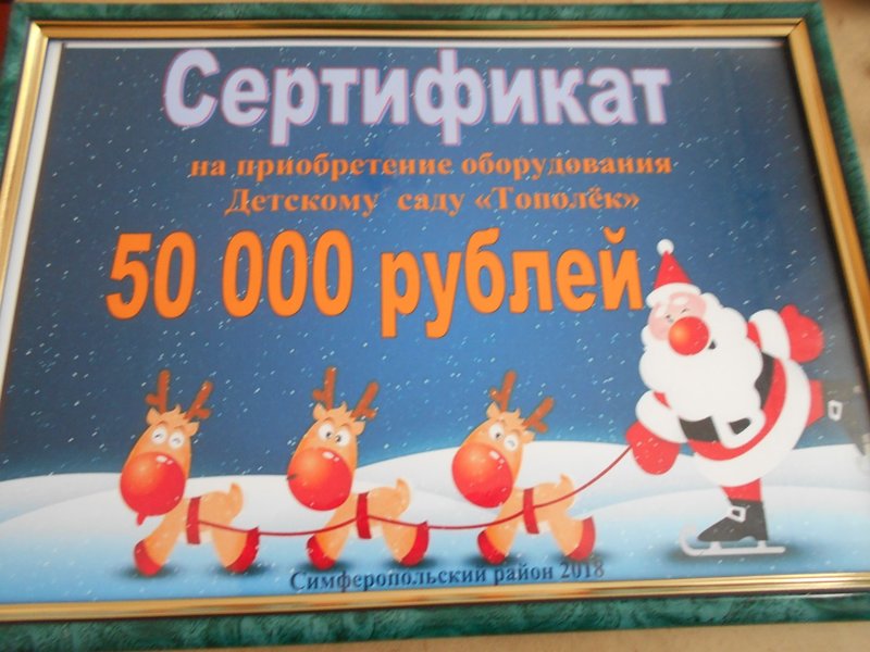 Козенко Андрей Дмитриевич поздравил всех присутствующих с наступающим Новым годом вручил заведующему Козаковой Жанне Николаевне Сертификат на приобретение оборудования детскому саду «Тополек» на сумму 50 000 рублей!