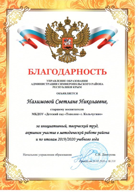 Старший воспитатель Налимова Светлана Николаевна за инициативный, творческий труд активное участие в методической работе района и по итогам 2019-2-20 учебного года получила Благодарность управления образования администрации Симферопольского района Республики Крым.