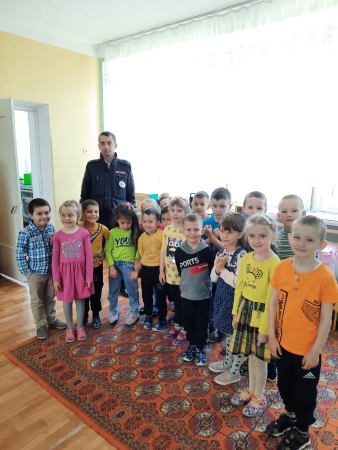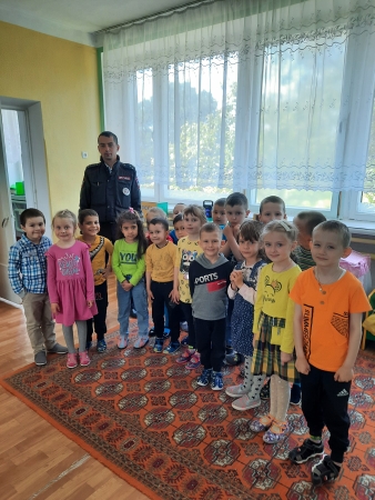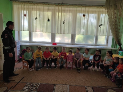Сегодня у нас в гостях инспектор ДПС. Он провел с детьми занятие о правилах дорожного движения.