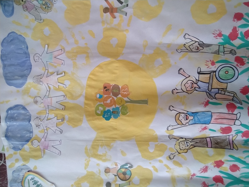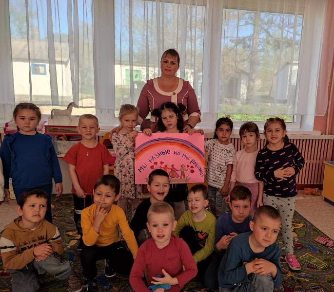 Педагог-психолог Лавриненко И.Е. организовала тренинг с педагогами на тему: «Толерантность как принцип взаимодействия между людьми» и круглый стол «Что такое инклюзивное образование?». Педагоги проводили игры и упражнения с детьми: «печатная машинка», «Построиться по росту», «Пять добрых слов», «На какого сказочного героя я похож?», «Правда или ложь?», «Угадай, о ком идет речь?». Педагог-психолог Ирина Евгеньевна провела с детьми старшего дошкольного возраста занятие на тему:»Доброта в моем сердце». Итогом стало оформление коллективных работ-плакатов «Разные возможности — равные права».